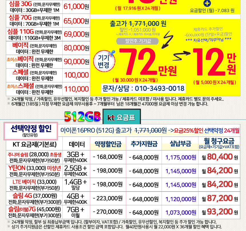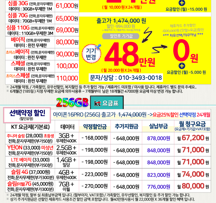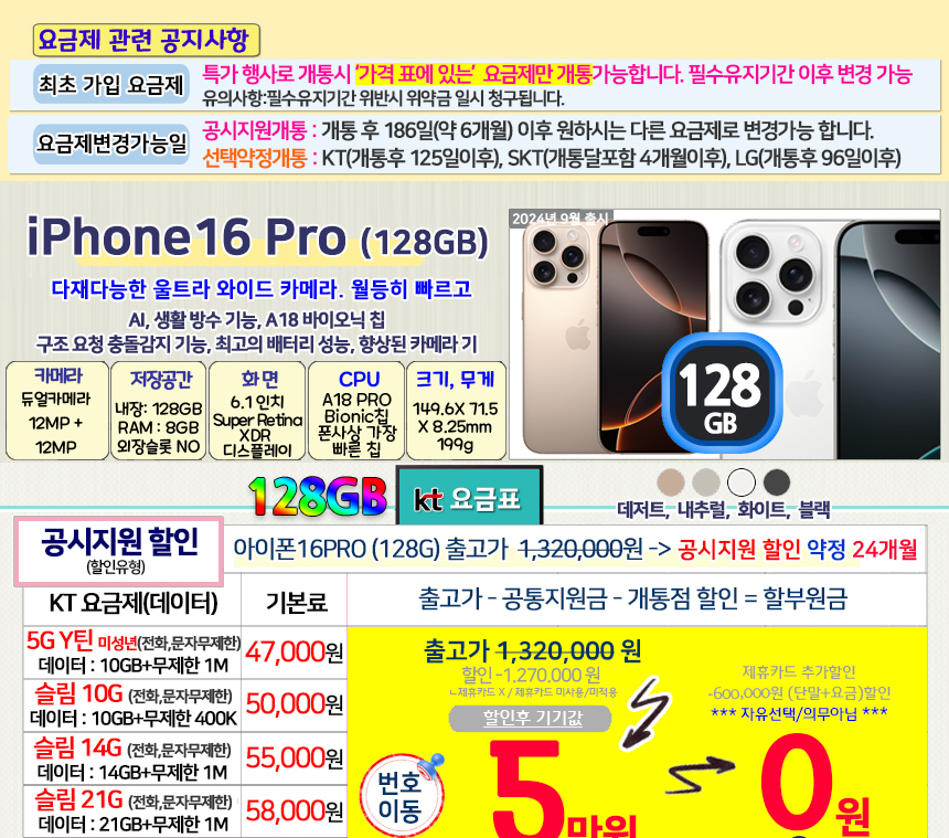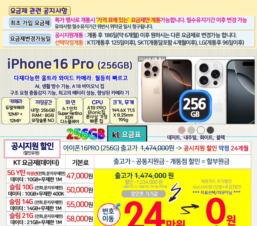 아이폰 16프로 256GB 번호이동/통신사이동 비밀특가폰 KT온라인샵